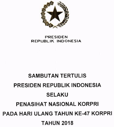 DEMIKIAN SAMBUTAN TERTULIS PRESIDEN RI PADA HUT KORPRI KE 47 TAHUN 2018