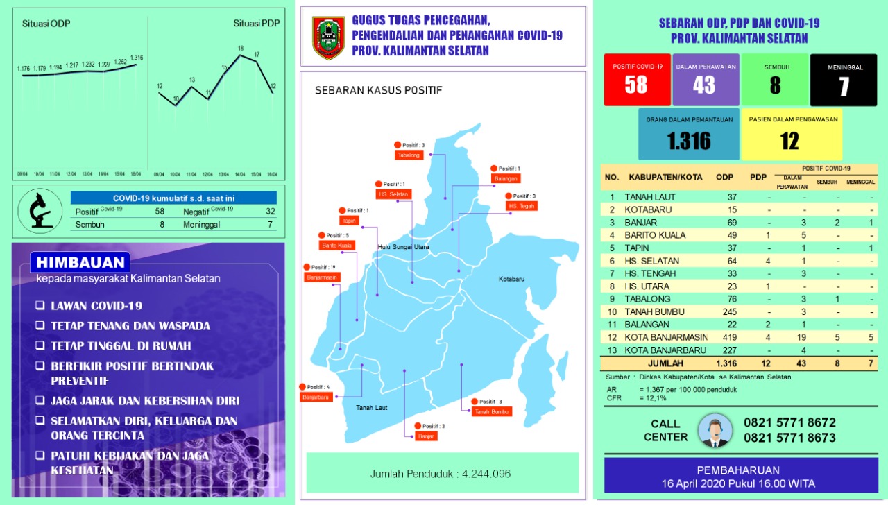 Terbaru, sebagaimana dilaporkan Gugus Tugas Percepatan Penanganan Covid-19 Kalsel, melalui juru bicaranya, HM Muslim, ada penambahan 9 kasus positif virus corona, sehingga total jumlah kasus positif virus corona menjadi 58 kasus.
