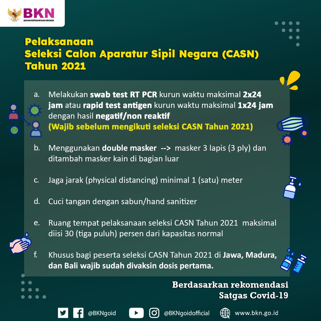 1. Melakukan swab test RT PCR kurun waktu maksimal 2×24 jam atau rapid test antigen kurun waktu maksimal 1×24 jam dengan hasil negatif/non reaktif. (Wajib sebelum mengikuti seleksi CASN Tahun 2021)