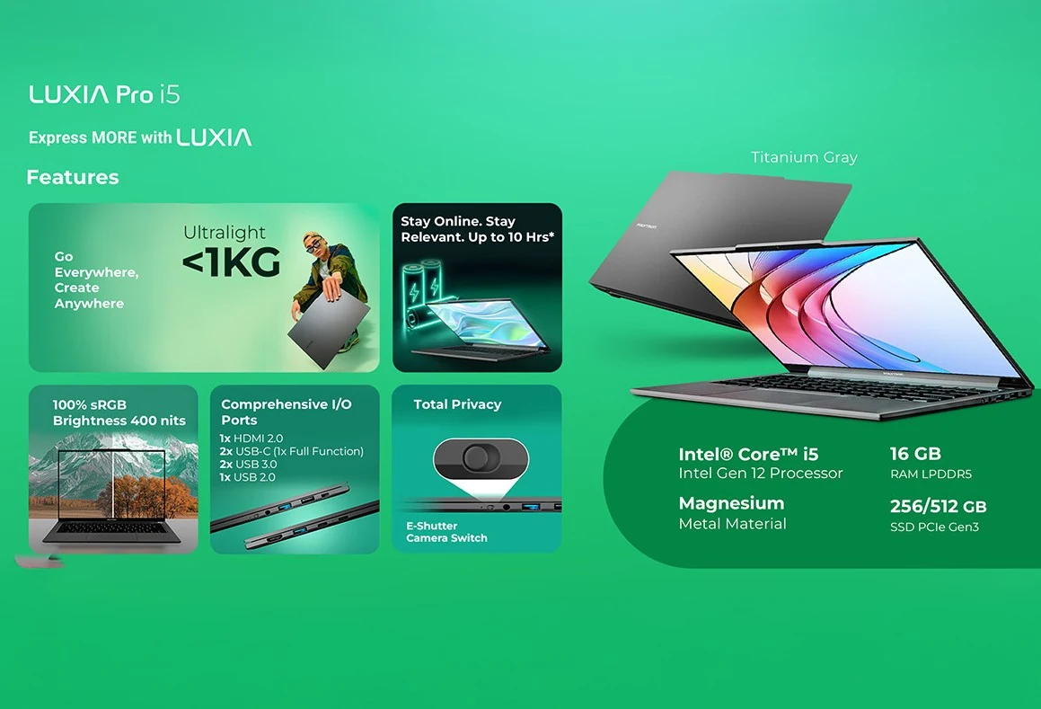 Menariknya, pembelian Luxia Pro i5 akan mendapatkan bonus berupa Smart CCTV yang bisa menjadi nilai tambah. Untuk pilihan warna, laptop ini hadir dalam warna Titanium Gray yang netral dan elegan, cocok untuk penggunaan bisnis maupun personal.